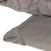 Questo copripiumino comprende un sacco da cm. 255×200 con pattella rimbocco in fondo ai piedi da cm. 60, due federe da cm. 52×82 e un lenzuolo inferiore con angolo da cm. 180x200x30, adatto anche ai materassi king size.