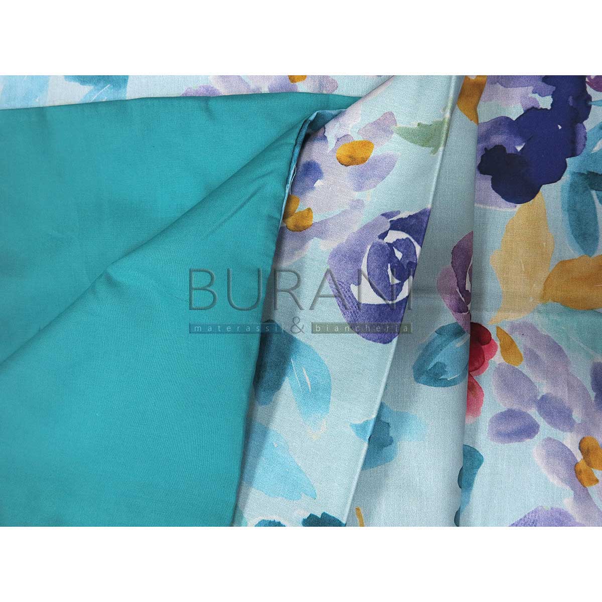 Il copripiumino matrimoniale Fazzini offerta si distingue per il suo design allegro e colorato, pensato per ravvivare la camera da letto con eleganza e personalità. Il sacco presenta un fronte con fantasia floreale luminosa e vivace, mentre il retro è in tinta unita turchese, perfetto per chi ama alternare stili diversi semplicemente girando il copripiumino.