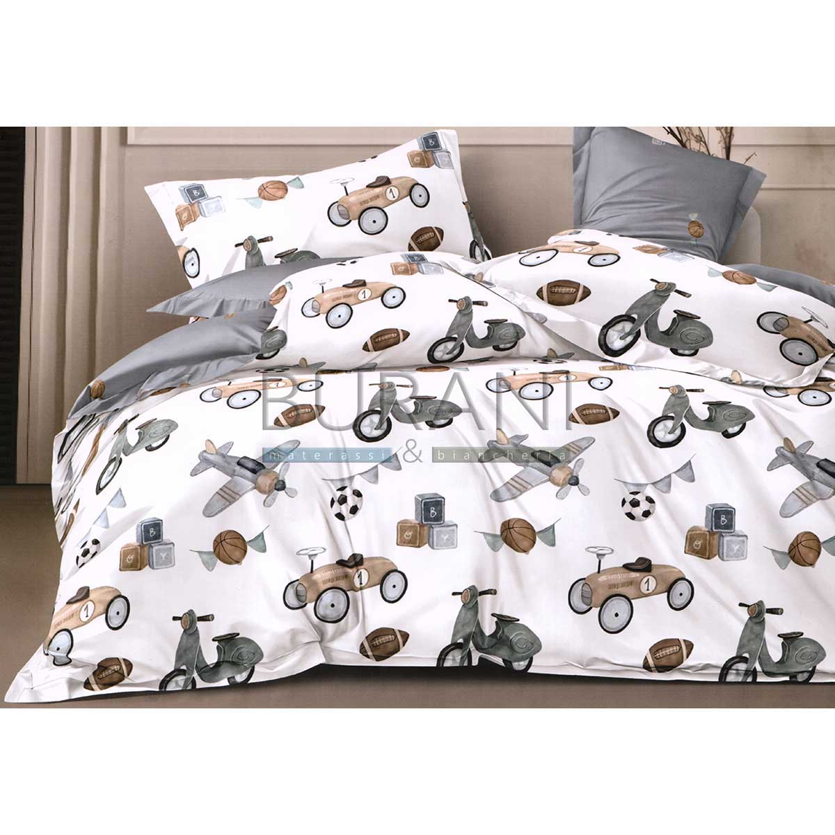 Dai un tocco di magia e stile alla tua camera con il Copripiumino con motorini e aeroplani, realizzato in percalle di cotone 100% tinto filo, un tessuto pregiato e resistente. Questo copripiumino è perfetto per chi cerca raffinatezza e comfort durante il riposo, unendo la qualità dei materiali alla bellezza di una fantasia ispirata al mondo fantastico dei Motorini e automobili vintage.