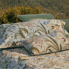 Le lenzuola Vanitas di Fazzini si distinguono per la ricercata stampa floreale presente su entrambi i lati delle due federe (cm 52×82), un dettaglio che valorizza il letto da ogni prospettiva. Il lenzuolo superiore (cm 260×295) è in tinta unita, impreziosito da una balza applicata coordinata alla fantasia delle federe, creando un raffinato richiamo decorativo.