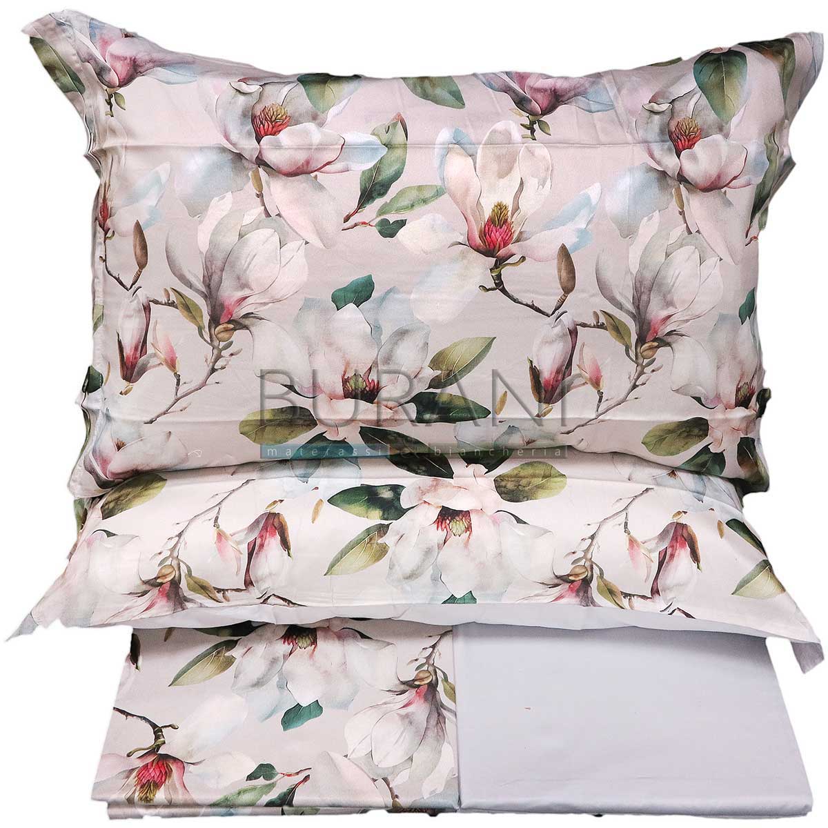 Il lenzuolo copriletto si distingue per la stampa doppia: la fantasia floreale si estende sia sulla balza che su tutta la superficie del lenzuolo superiore, garantendo un effetto finito che avvolge il letto senza necessità di un ulteriore copriletto.