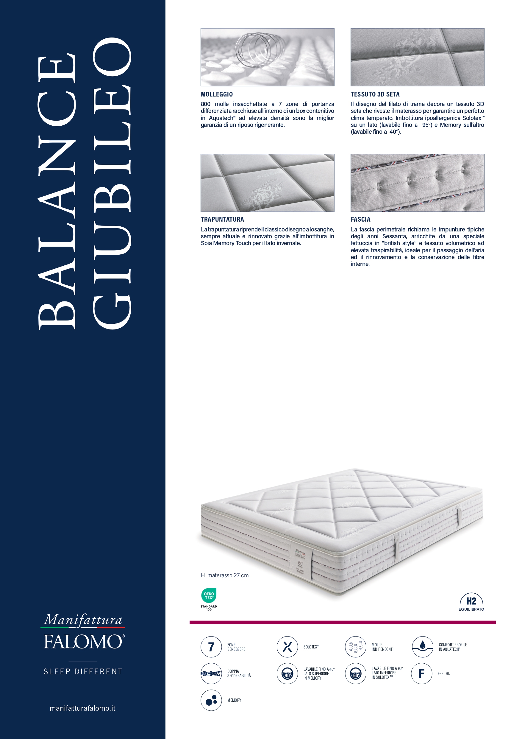 Il materasso Balance Giubileo è perfetto per qualsiasi stagione, grazie ai suoi due lati diversi che offrono il miglior microclima per il tuo riposo. Il lato estivo è realizzato con un’imbottitura ipoallergenica e altamente traspirante in Solotex™ e seta pregiata, mentre il lato invernale ti offre un supporto avvolgente grazie all’imbottitura in Soia Memory Touch e uno strato di Feel HD. Riposa comodamente tutto l’anno con il materasso Balance Giubileo. In breve, Materassi Falomo rivenditori garantiscono qualità e affidabilità per il tuo benessere.