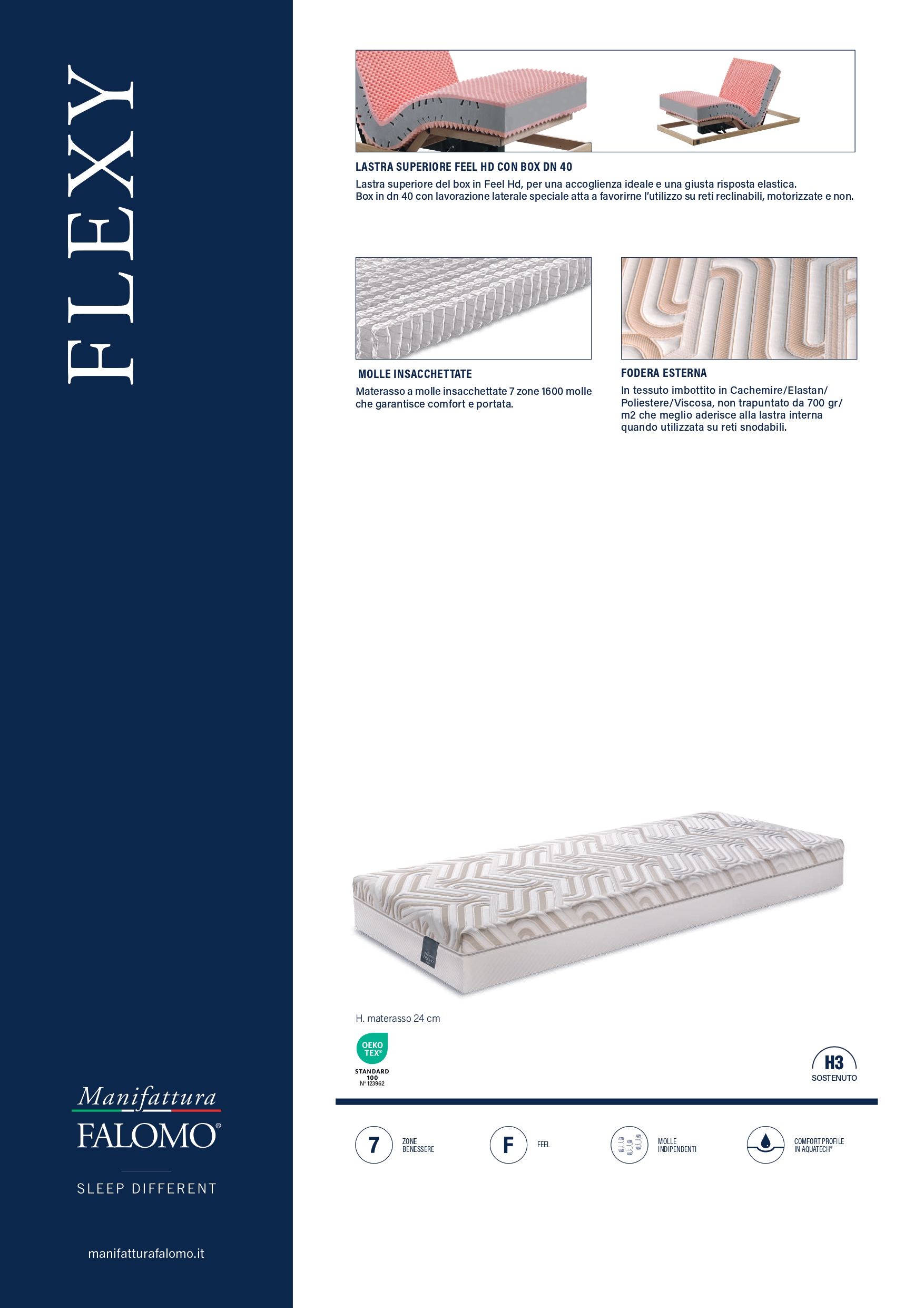 Lo strato superiore in Feel HD garantisce un’accoglienza ideale e una risposta elastica durante il sonno mentre, il box di DN 40 presenta una speciale lavorazione laterale per favorire l’utilizzo su reti reclinabili, sia motorizzate che manuali.