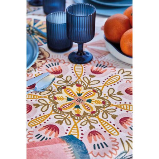 Una tovaglia antimacchia Reggio Emilia e no stiro con fantasia estiva Puebla, decorata con cocomeri e fiori stilizzati, arricchita da disegni geometrici sulla caduta laterale, è la scelta perfetta per una tavola fresca, vivace e raffinata.