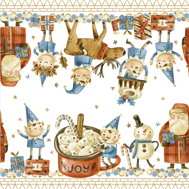 La fantasia di questa tovaglia è unica: folletti allegri, pacchi regalo e alci festosi corrono lungo tutta la superficie, regalando un tocco magico e gioioso.